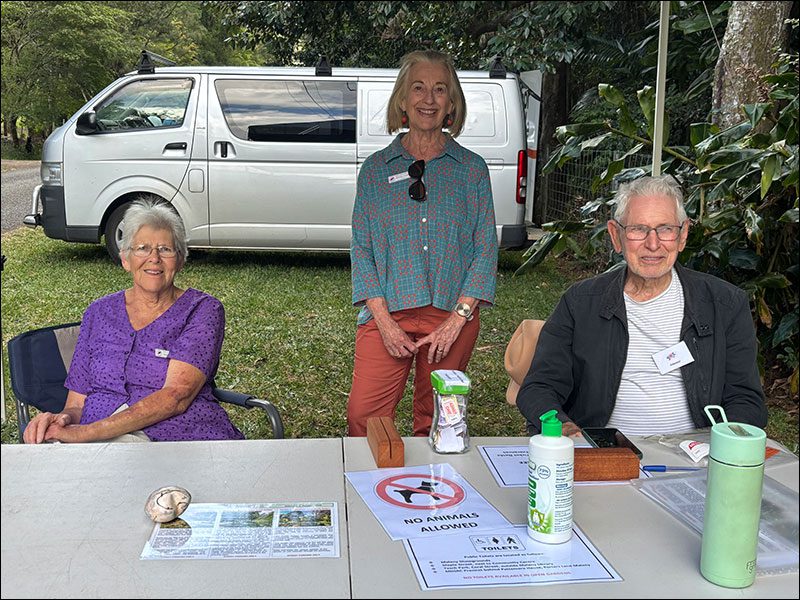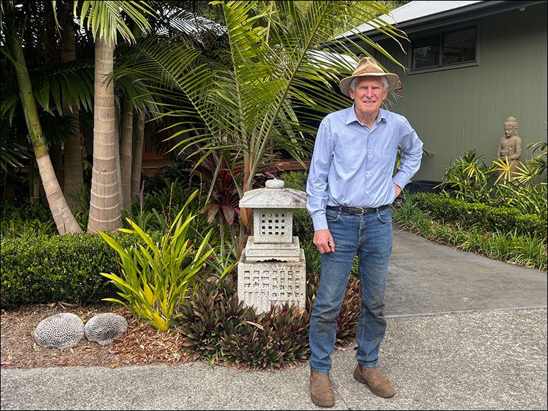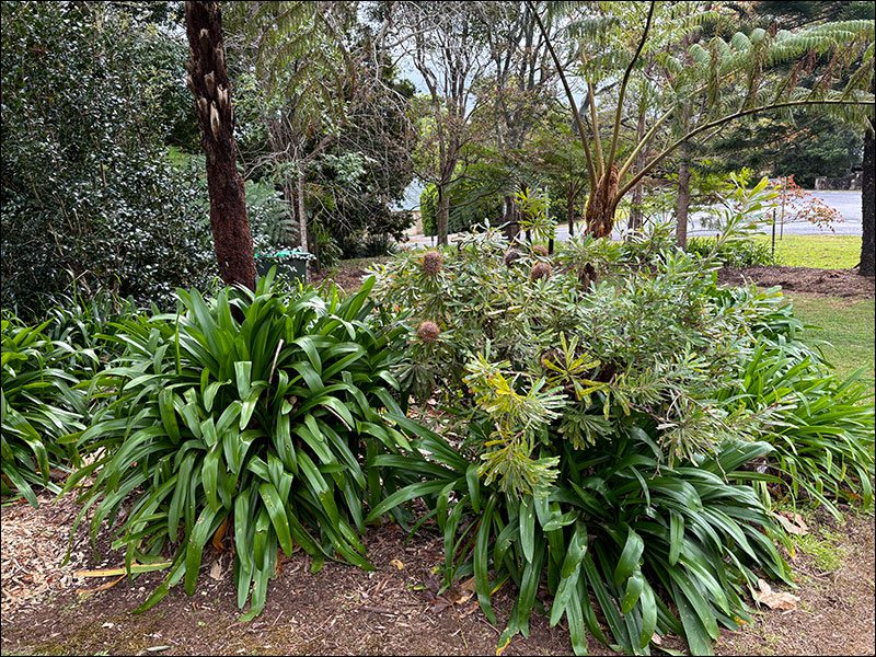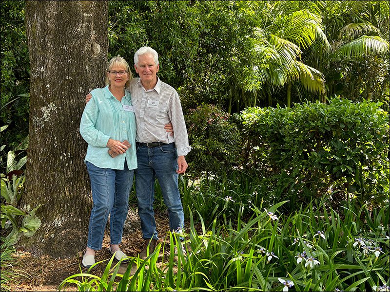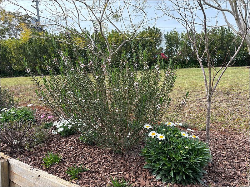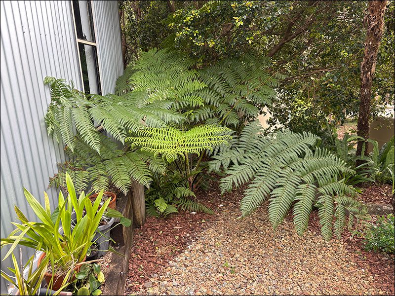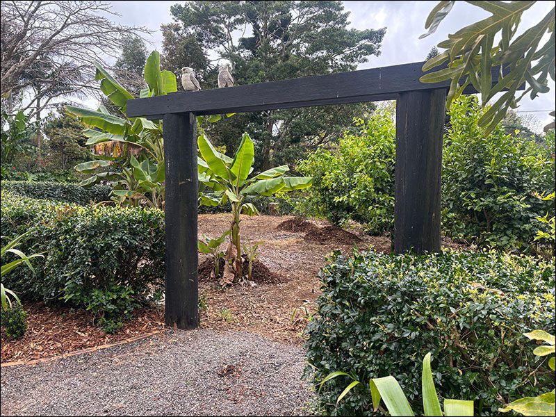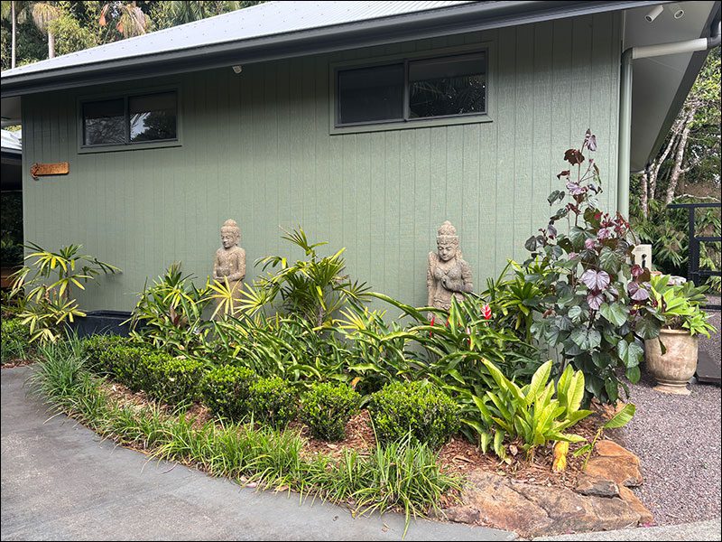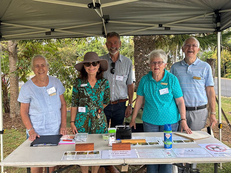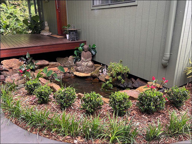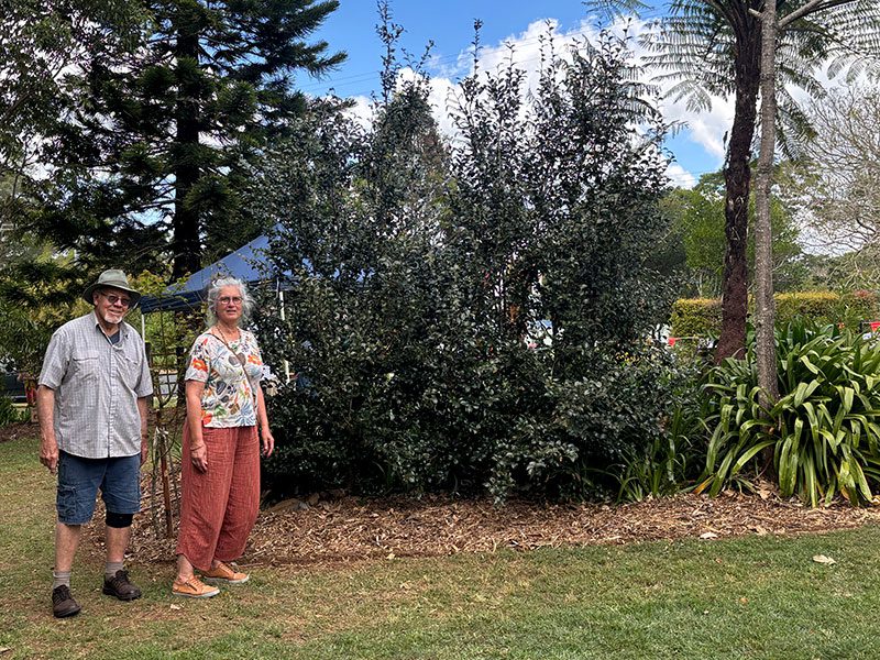 From the Garden Owners: Just over 3000sq metres, the block was part or an old dairy subdivided into smaller blocks. Purchased ten years ago, the cow paddock had two trees, one being the large Pine in the far comer, the other a Coral Tree which had to go for the house site. Weeds took up most of the block back then. Landscaping and planting became the main focus with the Murrayas along the fence line. Without town water we are reliant on rainfall. Being known as “Rainy Maleny” is good, but not always the case. Over in the far corner a mixture of Maples, Red Cedars, Flame Trees, Silky Oaks and Tree Ferns blend with our neighbours’ semi rainforest. At the front of the house is a newly planted area with small Flame Trees over over flowering Daisies. A Japanese Garden is being developed around the front cloor and will be a prominent feature as it grows in the ensuing years.