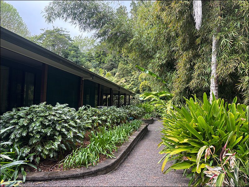 The formal hedges provide a framework that incorporates mostly subtropical gardens, an orchard of lemon, orange and mandarin trees, plus a forest walk.